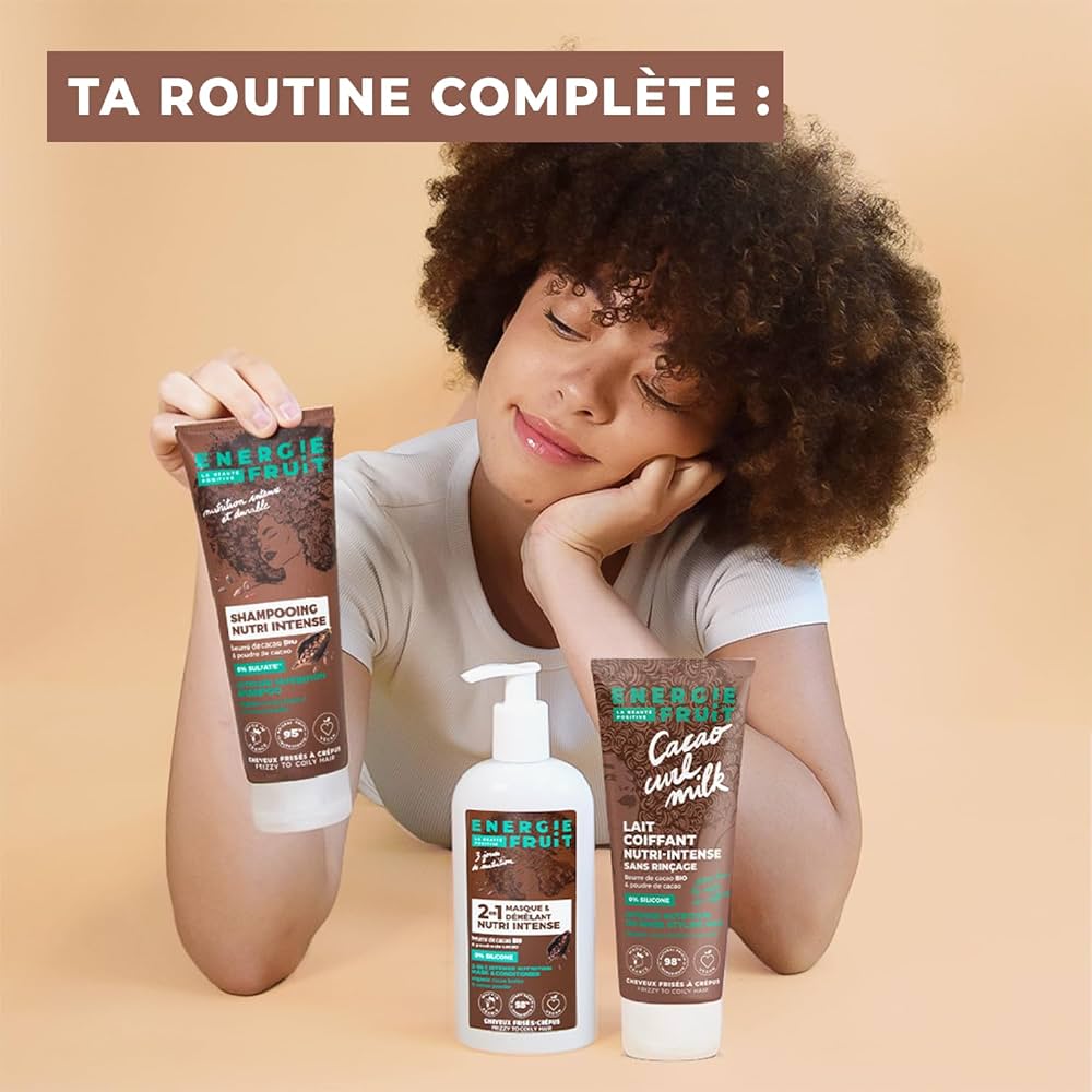 Masca și balsamul de descurcare 2 în 1 Energie Fruit, cu unt și pudră de cacao bio, oferă o hidratare intensă a părului, fiind special conceput pentru părul creț.