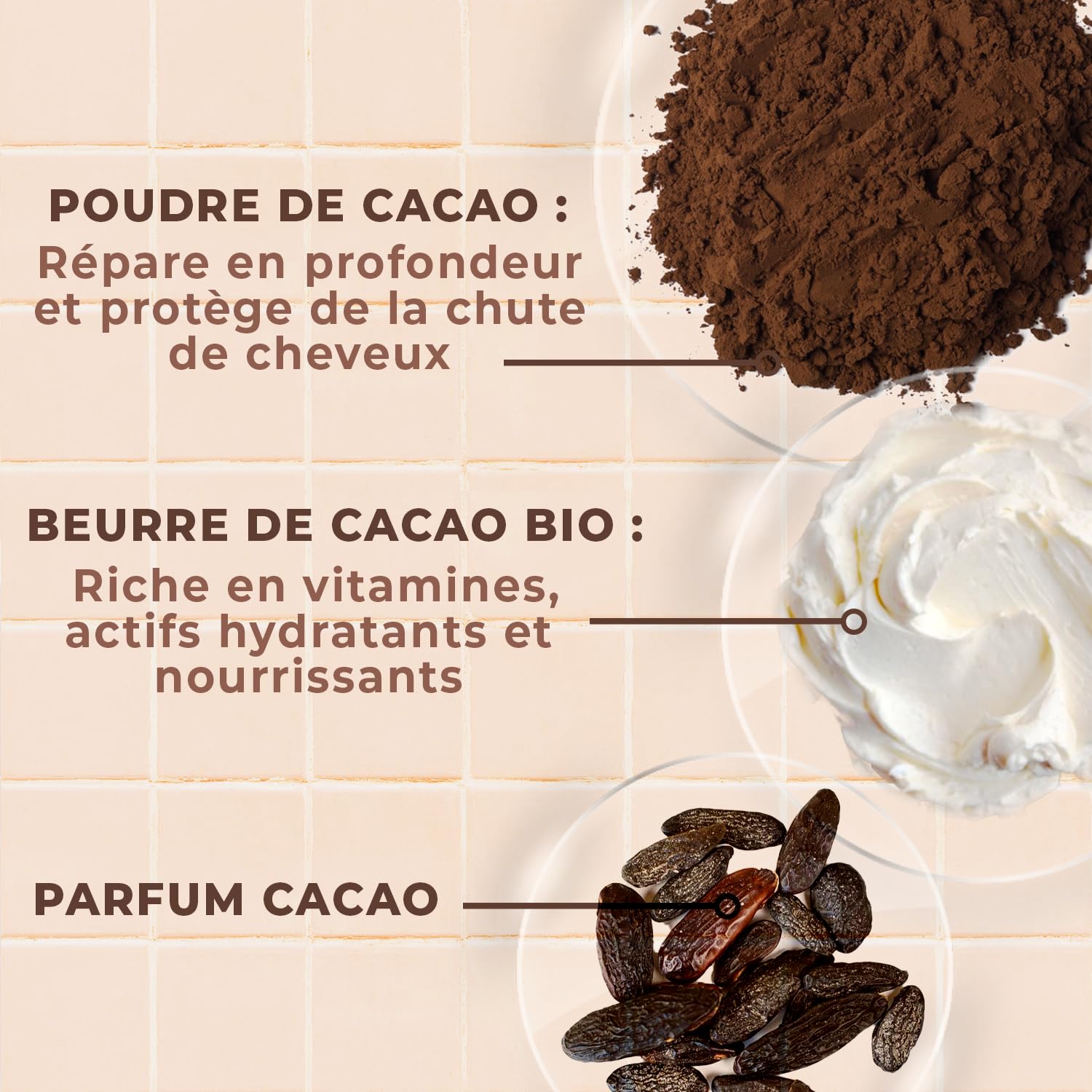 Îmbogățită cu unt de cacao organic și pudră de cacao, textura ultra-bogată alunecă peste fibra părului și o învăluie într-un tratament, care îi oferă toată hidratarea de care are nevoie, fără a o îngreuna.